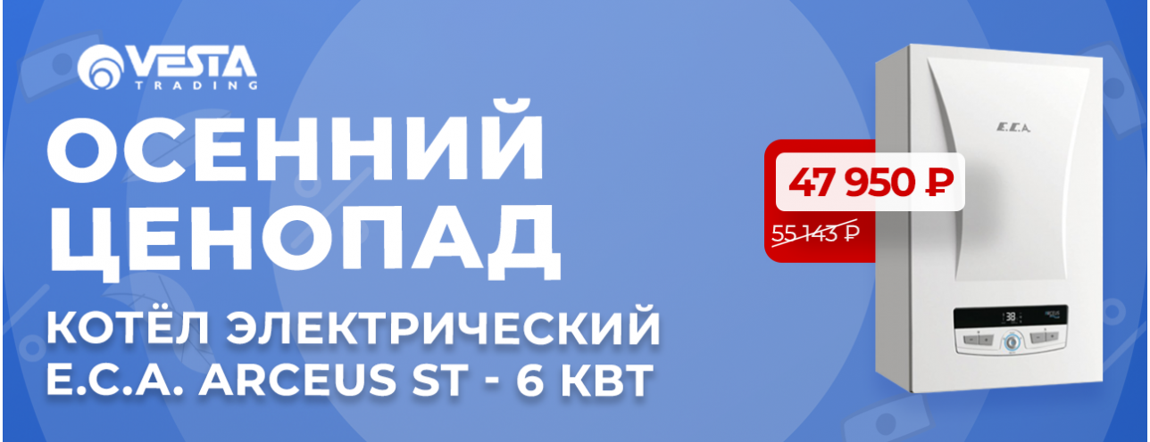 Уважаемые покупатели! В розничной сети "Веста Трейдинг" вас ждут специальные условия на покупку Котла электрического E.C.A. Arceus ST - 6 кВт (1 контур, 3х-ход. клапан с мотором, датчик бойлера). Ждем вас в наших магазинах и на сайте www.vestatr..