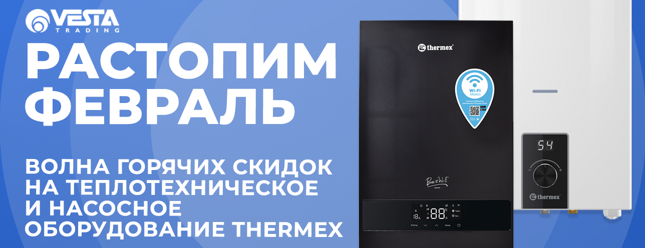 Уважаемые покупатели! Только до 28 февраля 2026 года в розничной сети "Веста Трейдинг" вас ждут специальные условия на покупку теплотехнического и насосного оборудования THERMEX из подборки. Ждем вас в наших магазинах и на сайте www.vestatrade.r..