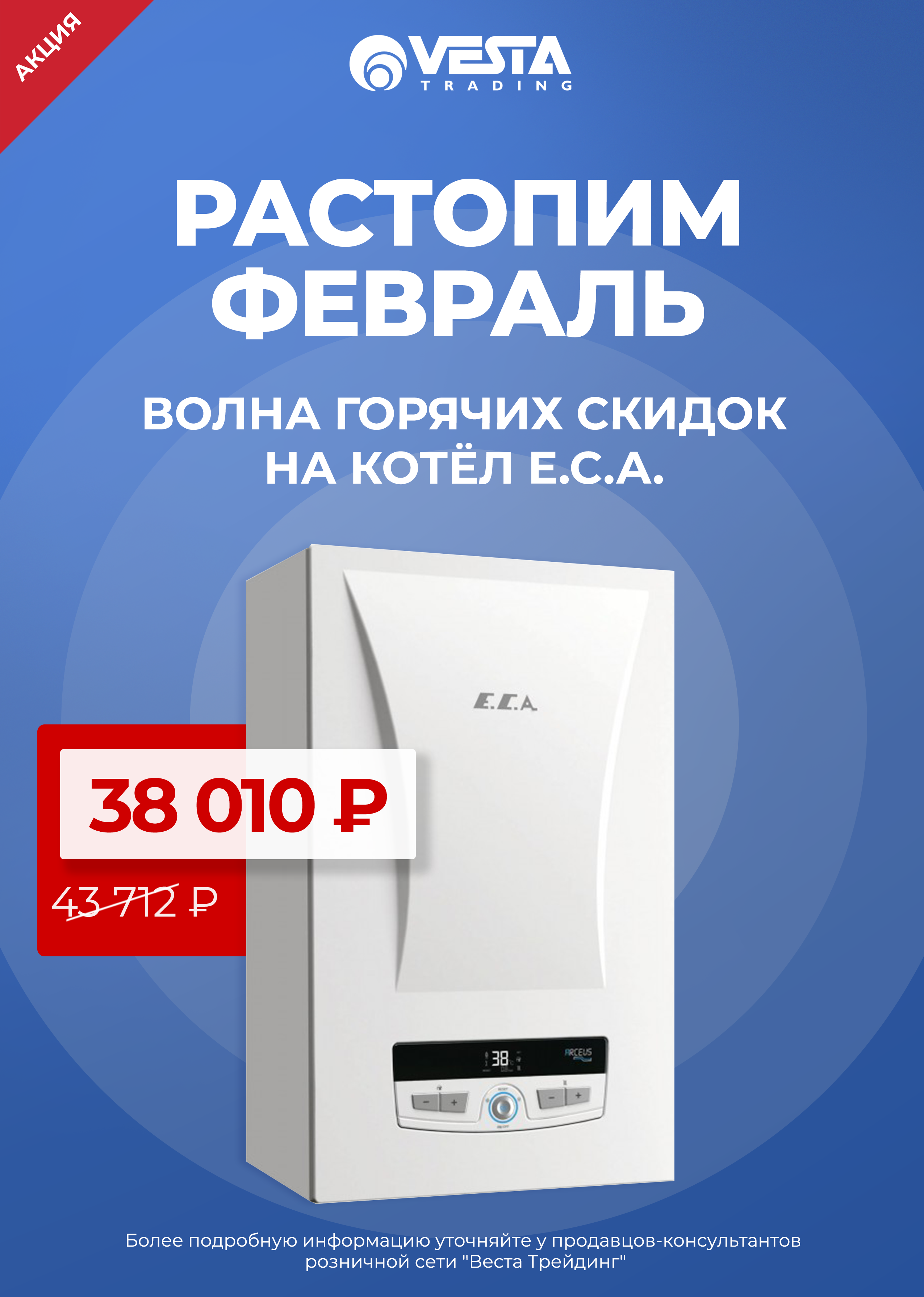 Уважаемые покупатели! В розничной сети "Веста Трейдинг" вас ждут специальные условия на покупку Котла электрического E.C.A. Arceus ST - 6 кВт (1 контур, 3х-ход. клапан с мотором, датчик бойлера). Ждем вас в наших магазинах и на сайте www.vestatrade.ru