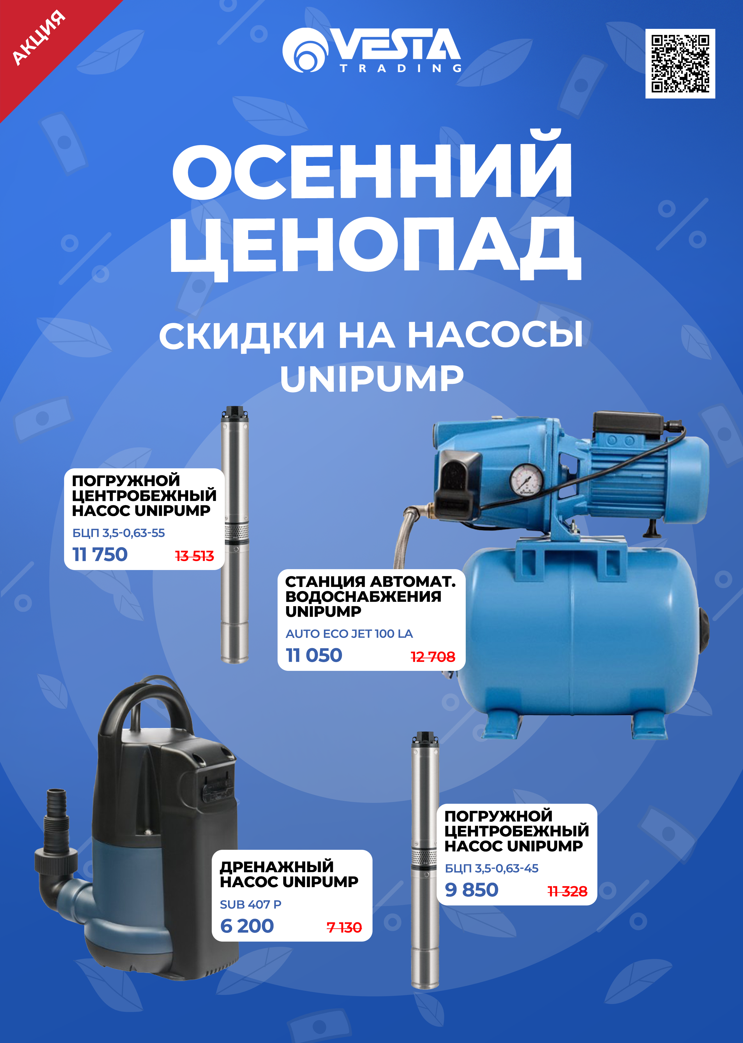 Уважаемые покупатели! В розничной сети "Веста Трейдинг" вас ждут специальные условия на покупку насосного оборудования Unipump из подборки. Ждем вас в наших магазинах и на сайте www.vestatrade.ru