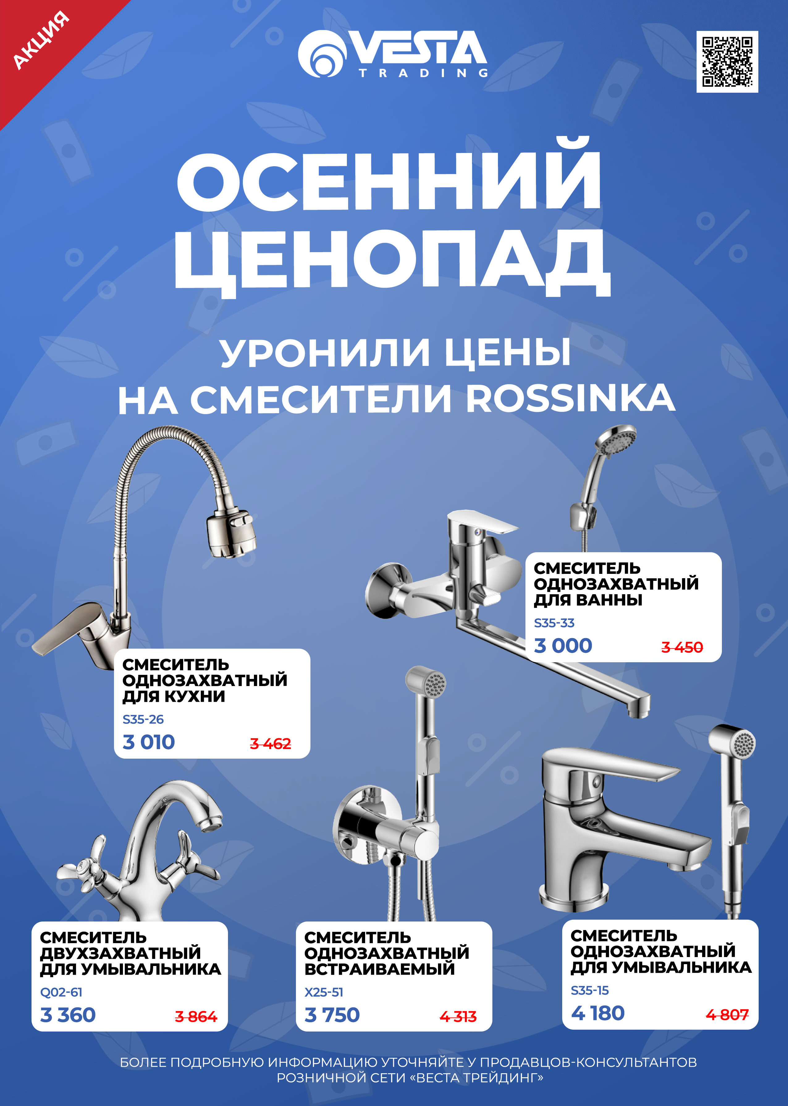Уважаемые покупатели! В розничной сети "Веста Трейдинг" вас ждут специальные условия на покупку смесителей Rossinka из подборки. Ждем вас в наших магазинах и на сайте www.vestatrade.ru