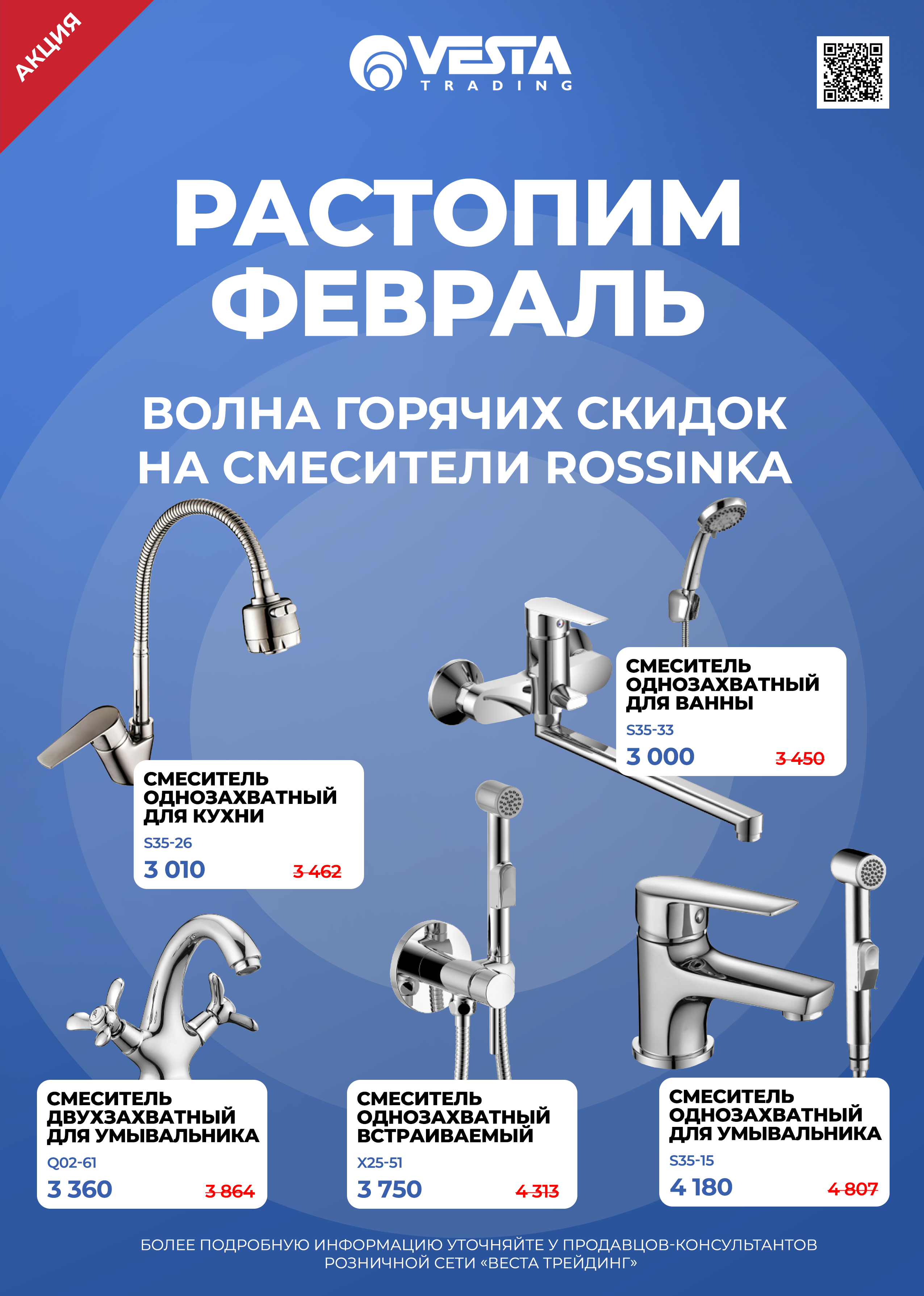 Уважаемые покупатели! В розничной сети "Веста Трейдинг" вас ждут специальные условия на покупку смесителей Rossinka из подборки. Ждем вас в наших магазинах и на сайте www.vestatrade.ru