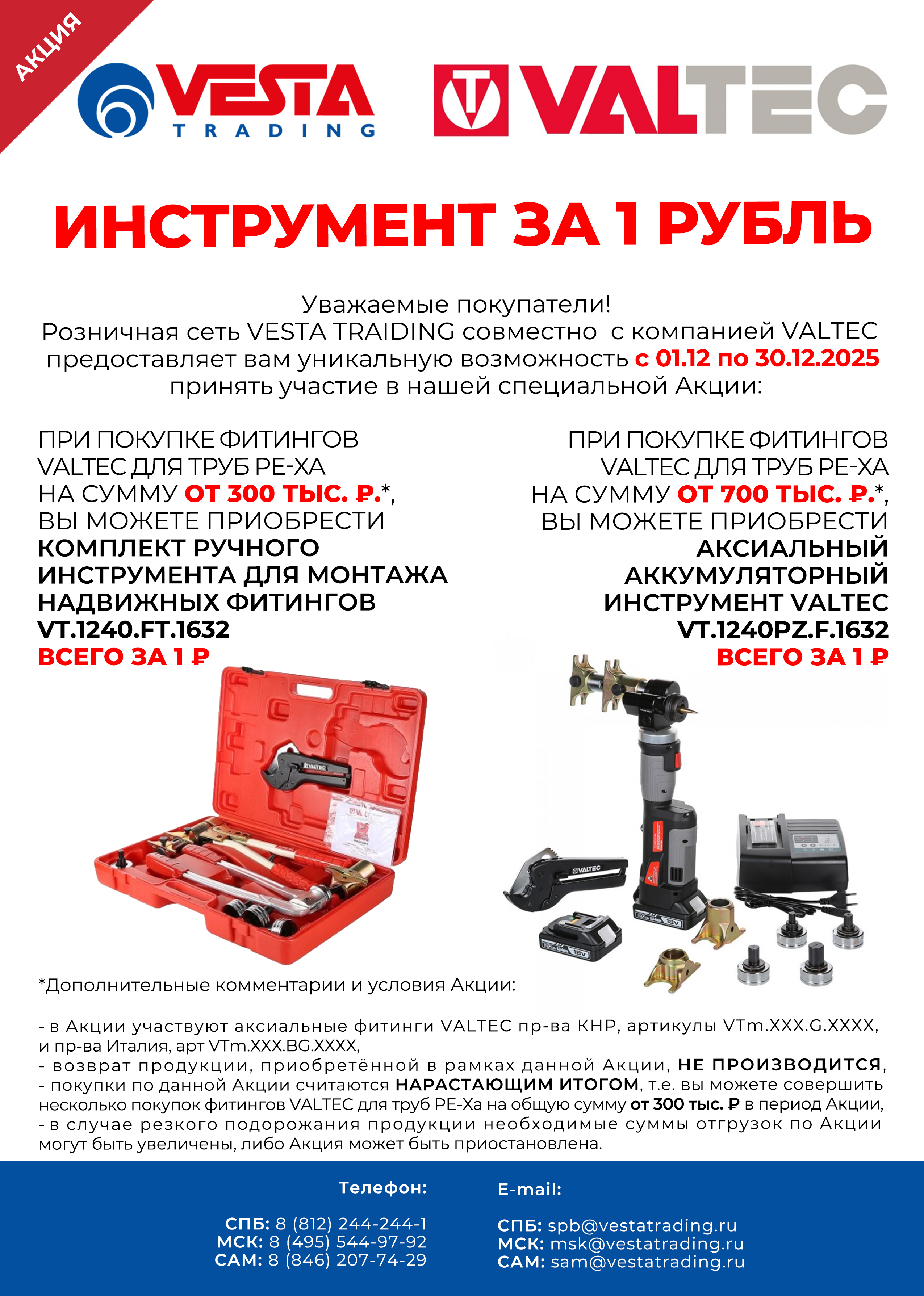при покупке фитингов VALTEC для труб PE-Xa на сумму от 300 тыс. рублей вы можете всего за 1 рубль приобрести комплект ручного инструмента для монтажа надвижных фитингов VALTEC (VT.1240.FT.1632), а при покупке фитингов VALTEC для труб PE-Xa на сумму от 700 тыс. рублей - аксиальный аккумуляторный инструмент VALTEC (VT.1240PZ.F) всего за 1 рубль. Подробную информацию об акции вы можете узнать у продавцов-консультантов розничной сети "Веста Трейдинг".