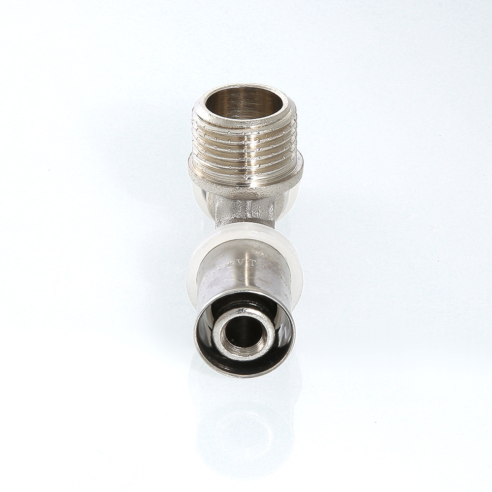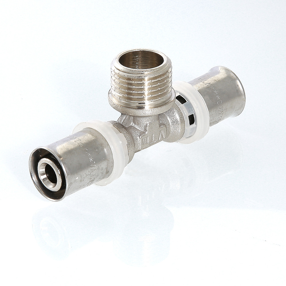 Пресс-фитинг – тройник с переходом на наружную резьбу предназначен для подсоединения к металлопластиковым (металлополимерным) трубам или трубам из сшитого полиэтилена элемента системы с внутренней резьбой.