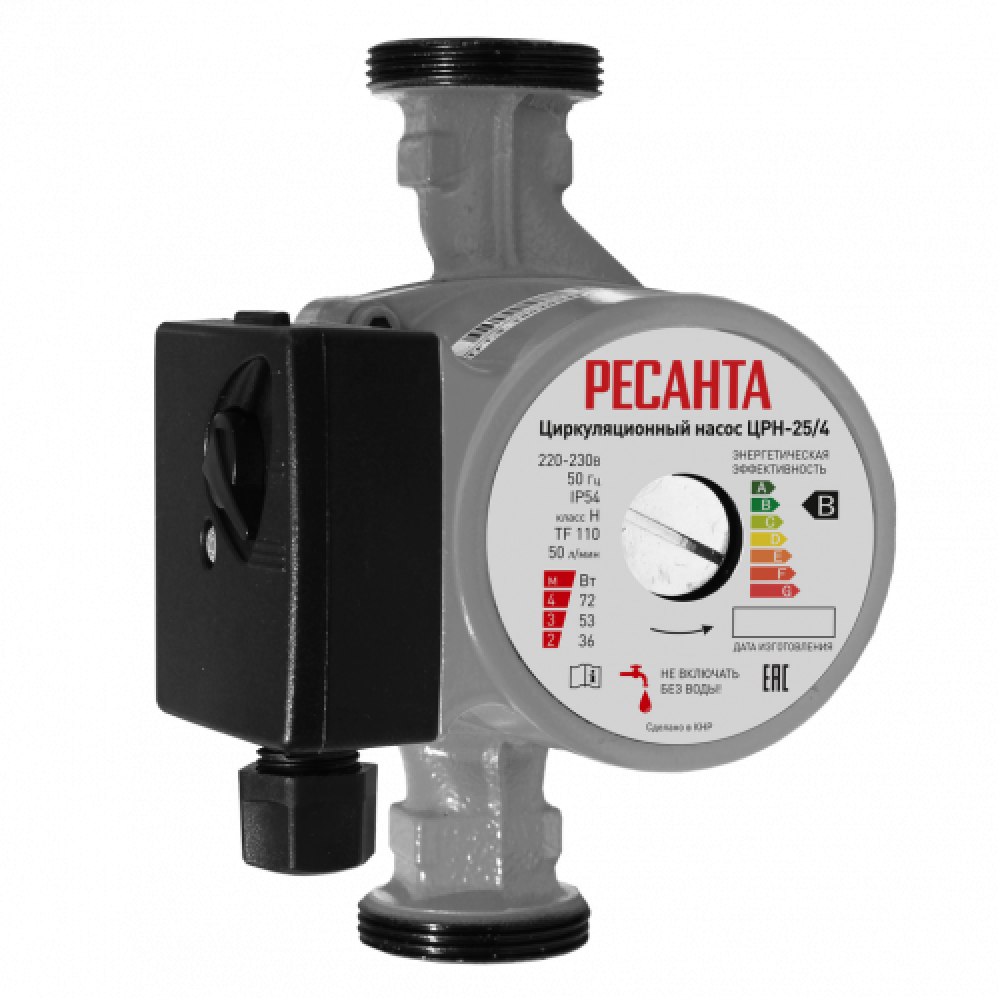 Циркуляционный насос Ресанта ЦРН-25/4 с трехступенчатой мощностью 36/53/72 Вт, максимальным напором до 4 м и потоком до 50 л/мин предназначен для циркуляции теплоносителя в замкнутых системах отопления.