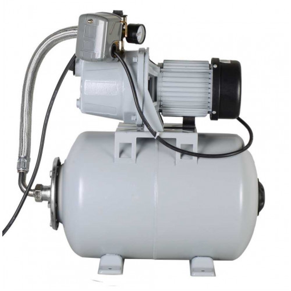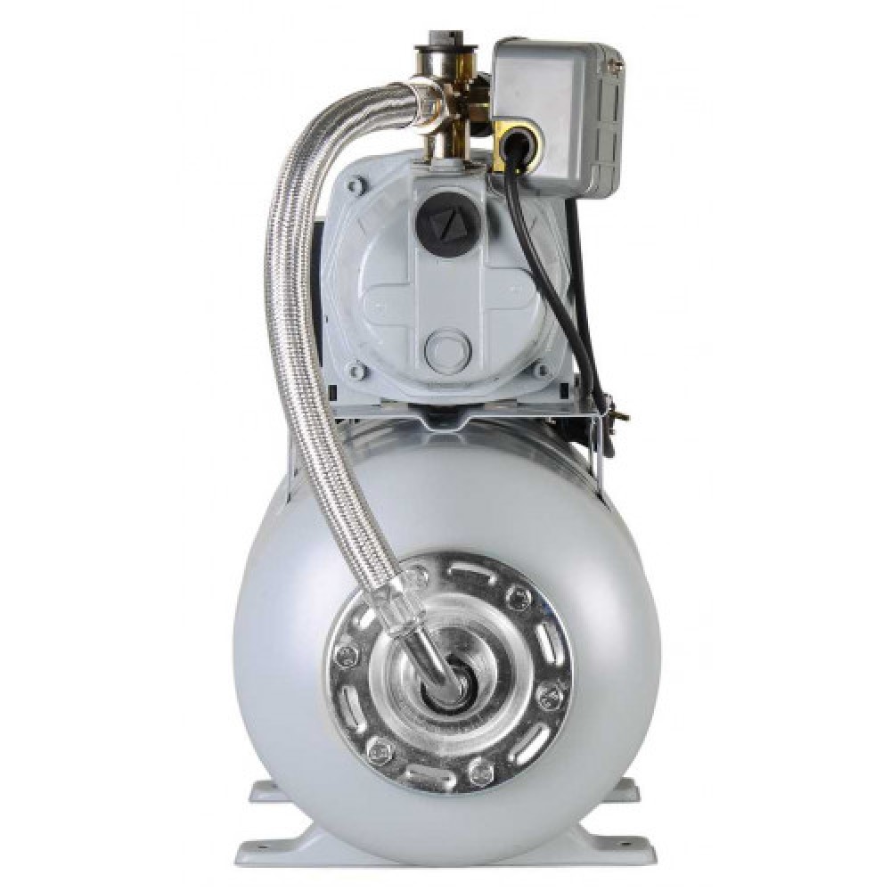 Станция собрана с гидроаккумулятором 24 л; в этой версии корпус насосной части выполнен из чугуна, а включение/отключение происходит автоматически по сигналу реле давления.