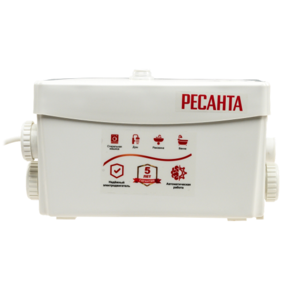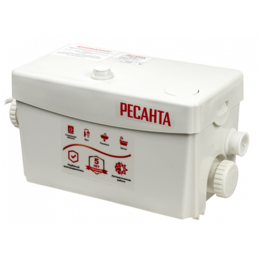 Канализационная установка Ресанта КН 2D мощностью 300 Вт и производительностью до 100 л/мин предназначена для отвода сточных вод от умывальника, душа и других бытовых сливов там, где невозможно сделать самотёк по наклонным трубам.