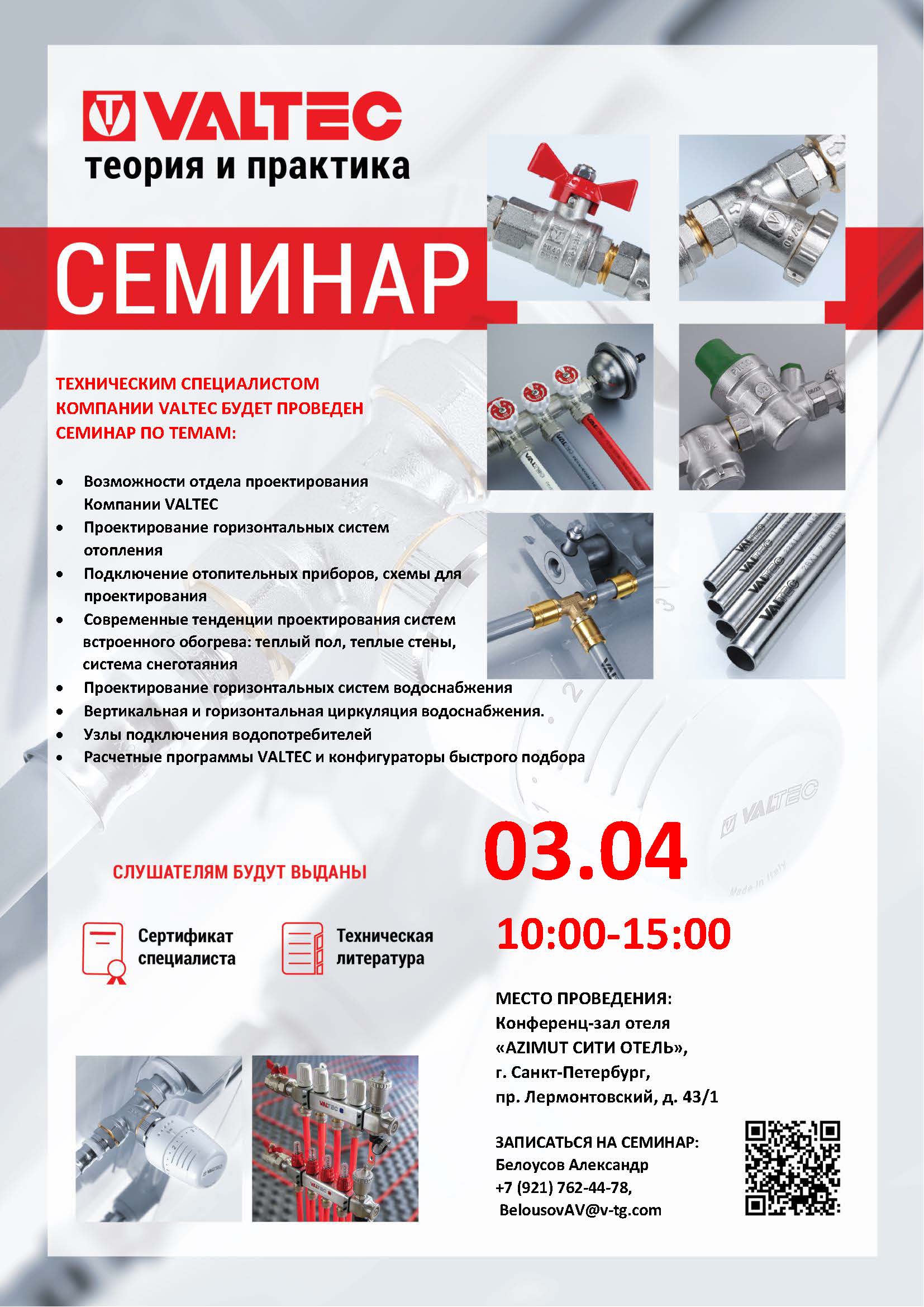 Компания VALTEC приглашает вас, ваших коллег и партнеров на открытый семинар, который пройдет в Санкт-Петербурге, в конференц-зале гостиницы «AZIMUT Сити Отель» 03 апреля 2026 года с 10:00 до 15:00.