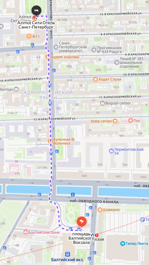 Схема прохода от ст. м. «Балтийская» до гостиницы «AZIMUT Сити Отель»: