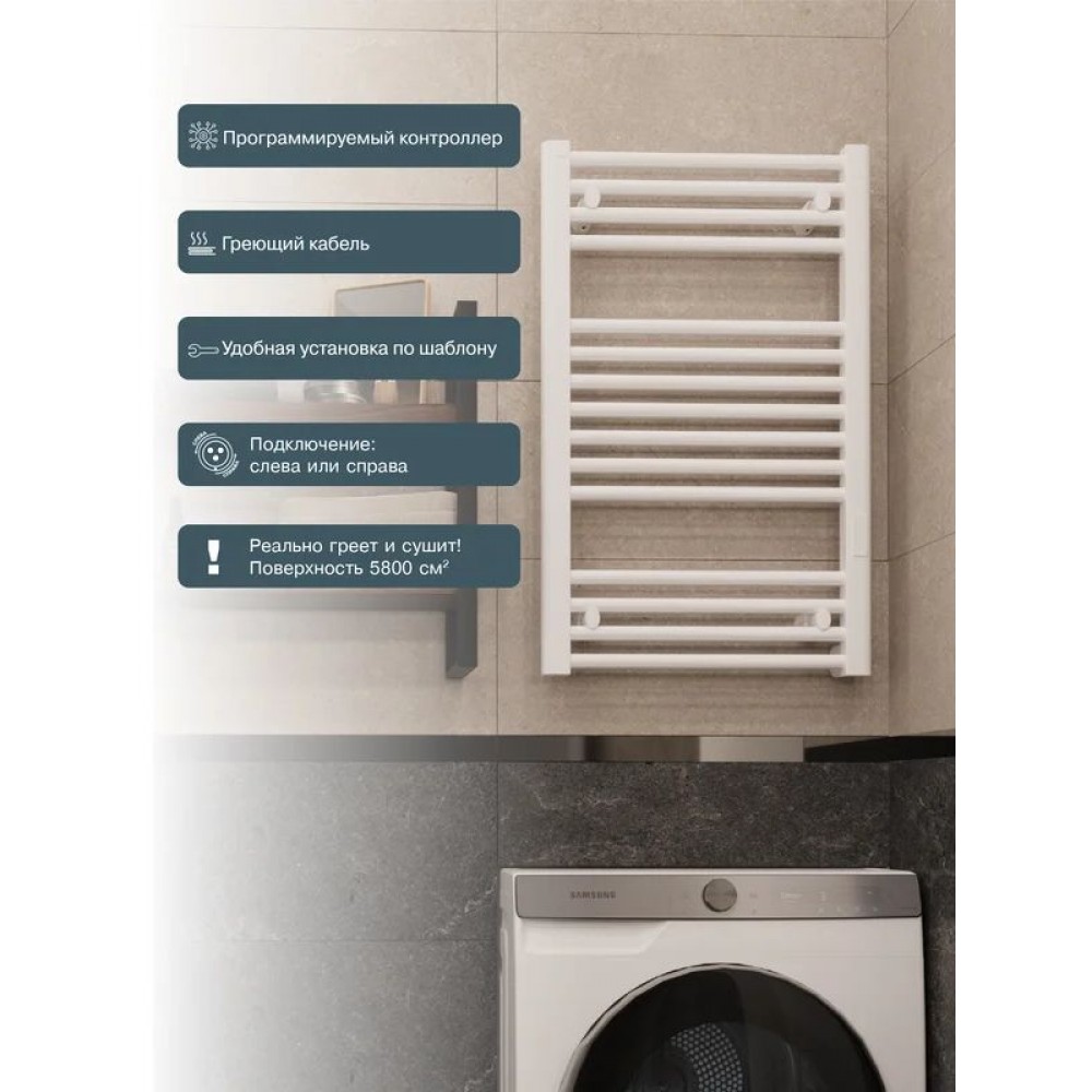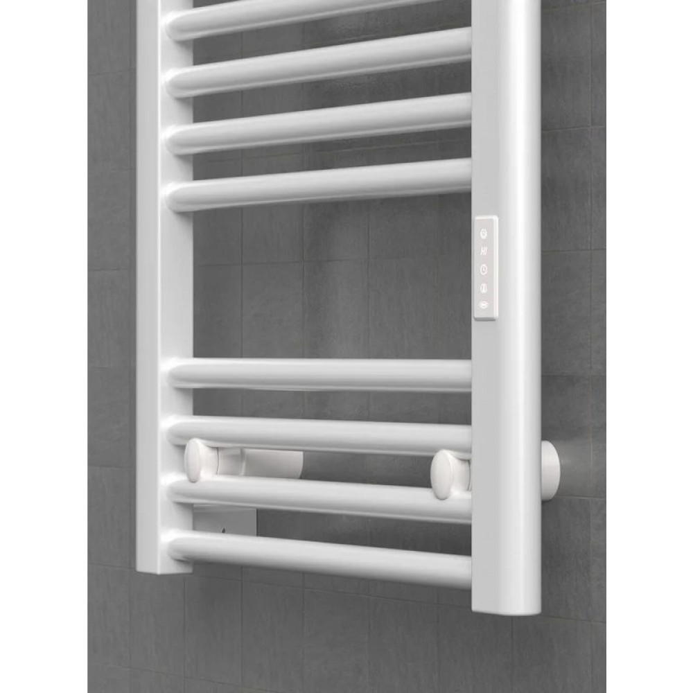 Электрический полотенцесушитель выполнен в современном дизайне и представлен в белом цвете. Устройство предназначено для быстрого и равномерного прогрева ванной комнаты, сушки полотенец и белья. Подходит для любых типов помещений, включая квартиры и частные дома.