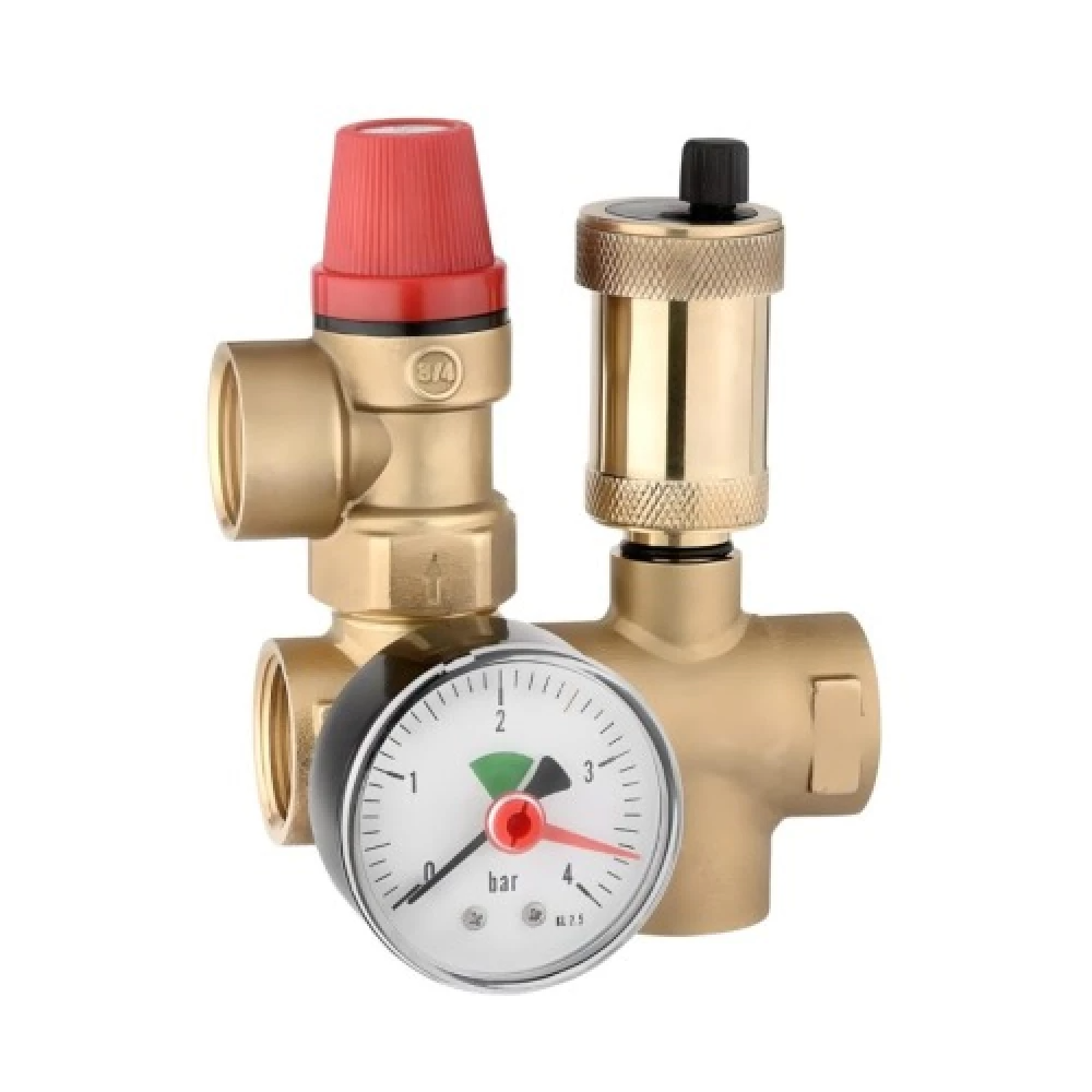 - ✓ Обеспечивает сброс избыточного давления, удаление воздуха и визуальный контроль давления в системе