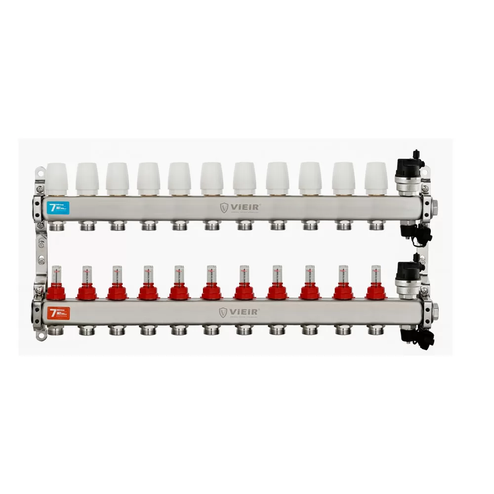 Коллекторная группа VIEIR VR123-11A 1"x3/4", 11 выходов — коллекторный блок из нержавеющей стали с расходомерами для распределения теплоносителя по одиннадцати контурам системы отопления или тёплого пола, без шаровых кранов на подаче и обратке.