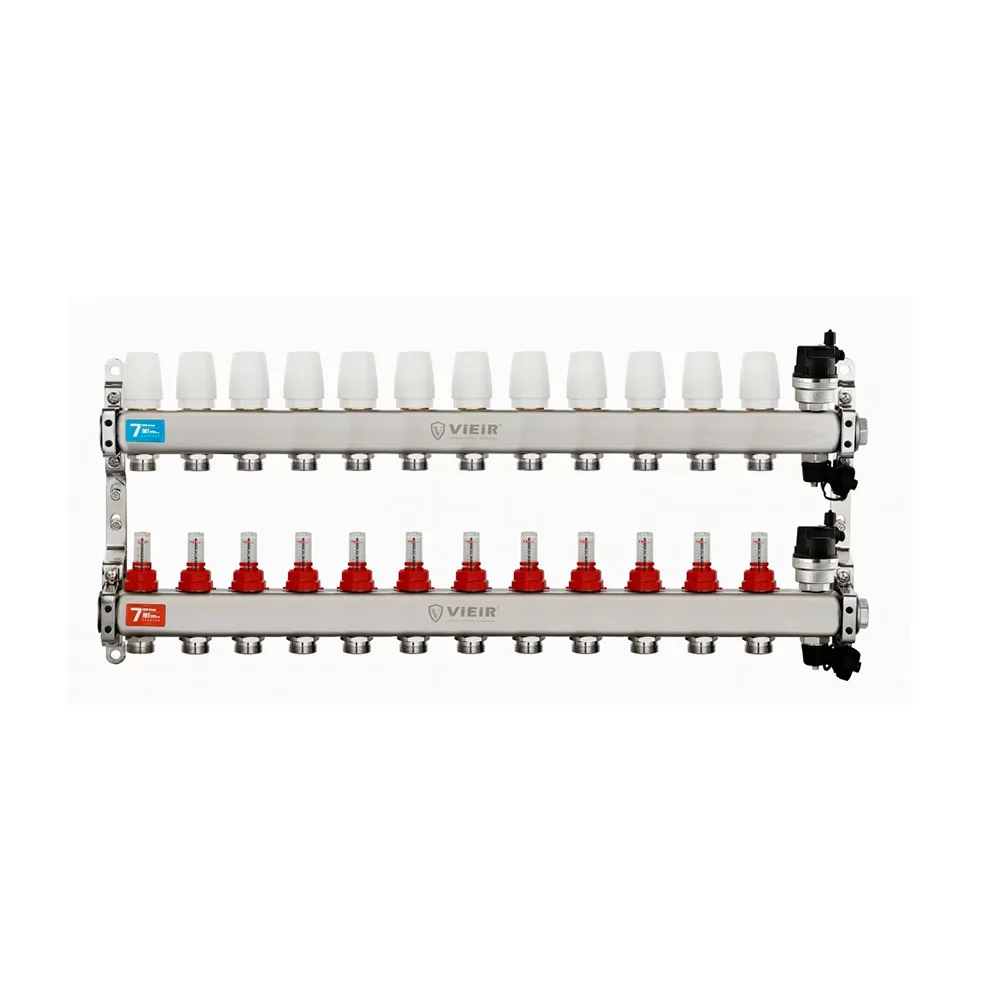 Коллекторная группа VIEIR VR123-12A 1"x3/4", 12 выходов — самая вместительная коллекторная сборка серии VR123 из нержавеющей стали с расходомерами, рассчитанная на двенадцать контуров отопления или тёплого пола. Поставляется без шаровых кранов.
