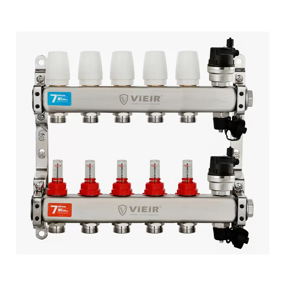 Коллекторная группа VIEIR VR123-05A 1"x3/4", 5 выходов — коллекторный блок из нержавеющей стали с расходомерами для пяти контуров, предназначенный для распределения теплоносителя в системах радиаторного отопления и тёплого пола, без шаровых кранов.