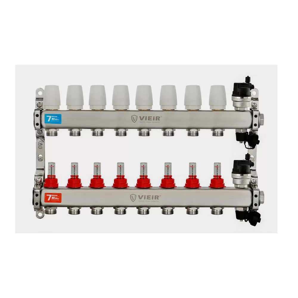 Коллекторная группа VIEIR VR123-08A 1"x3/4", 8 выходов — коллекторный блок из нержавеющей стали с расходомерами для восьми контуров отопления или тёплого пола, поставляется без шаровых кранов.