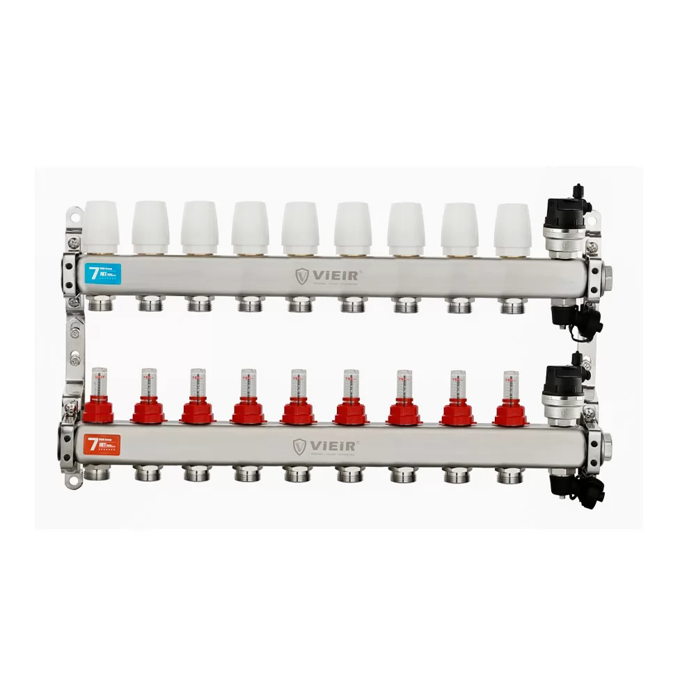 Коллекторная группа VIEIR VR123-09A 1"x3/4", 9 выходов — девятиконтурный коллектор из нержавеющей стали с расходомерами для распределения и регулирования потоков теплоносителя в системах водяного отопления и тёплых полов, без шаровых кранов.