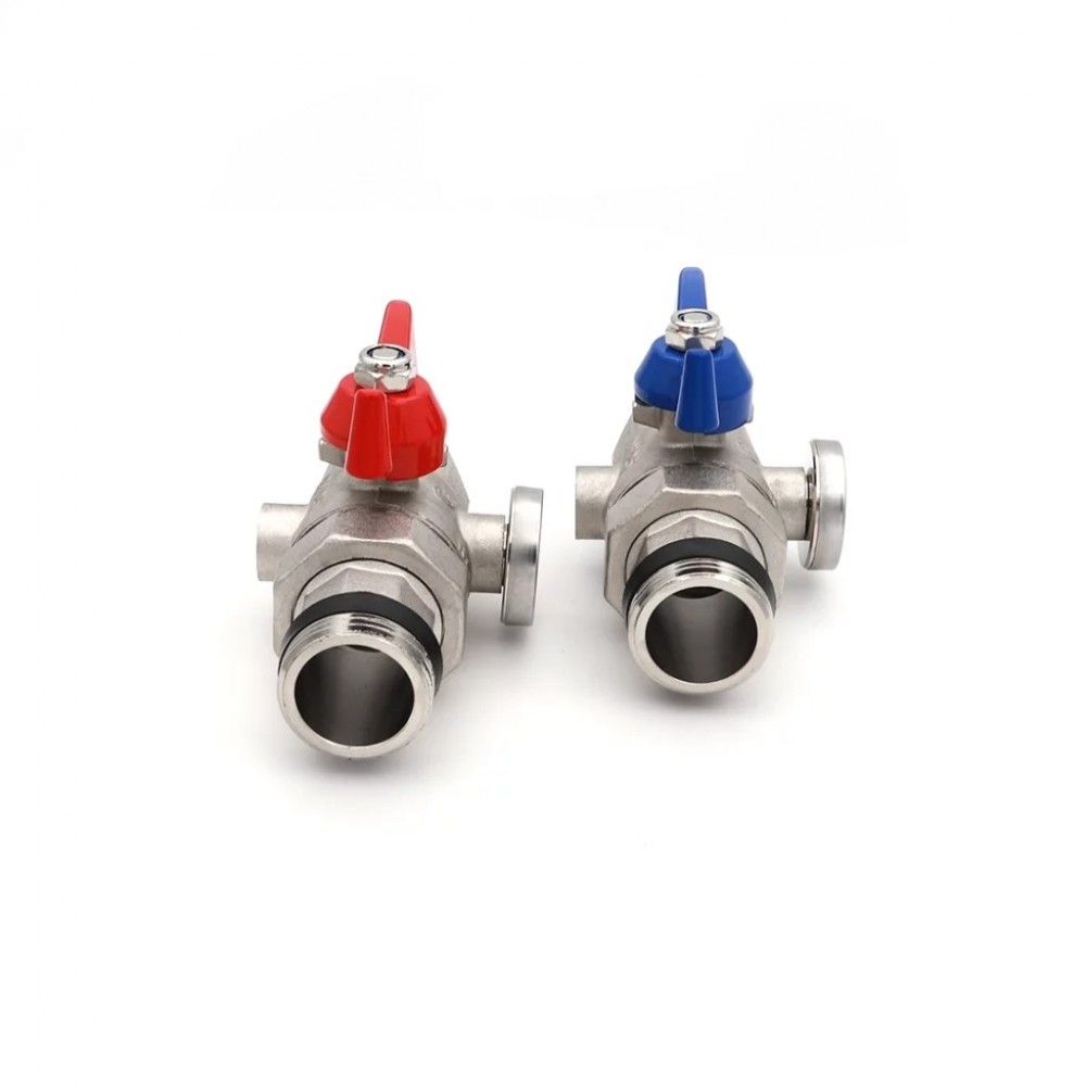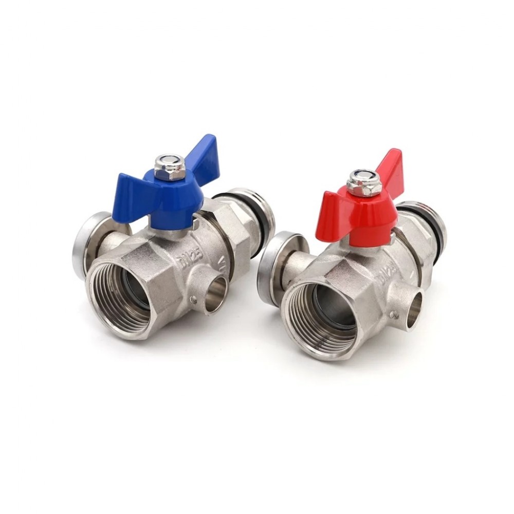 Комплект прямых шаровых кранов с полусгоном и встроенными термометрами используется для обвязки коллекторных блоков в системах отопления, в том числе водяного теплого пола. Краны изготовлены из латуни, поставляются парой с красной и синей рукоятками-бабочками для разделения потоков подачи и обратки.