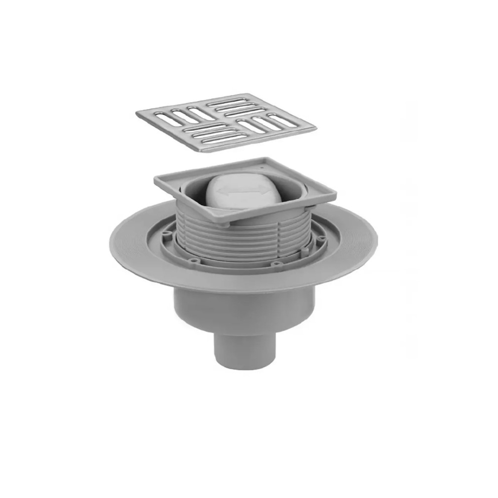 Душевой трап вертикальный 50 мм с сухим затвором, решётка 100×100 мм VIEIR VRDS-10 — точечный слив из ABS-пластика с декоративной решёткой из нержавеющей стали, предназначенный для отвода воды в душевых и ванных комнатах, а также в бассейнах и СПА-зонах.