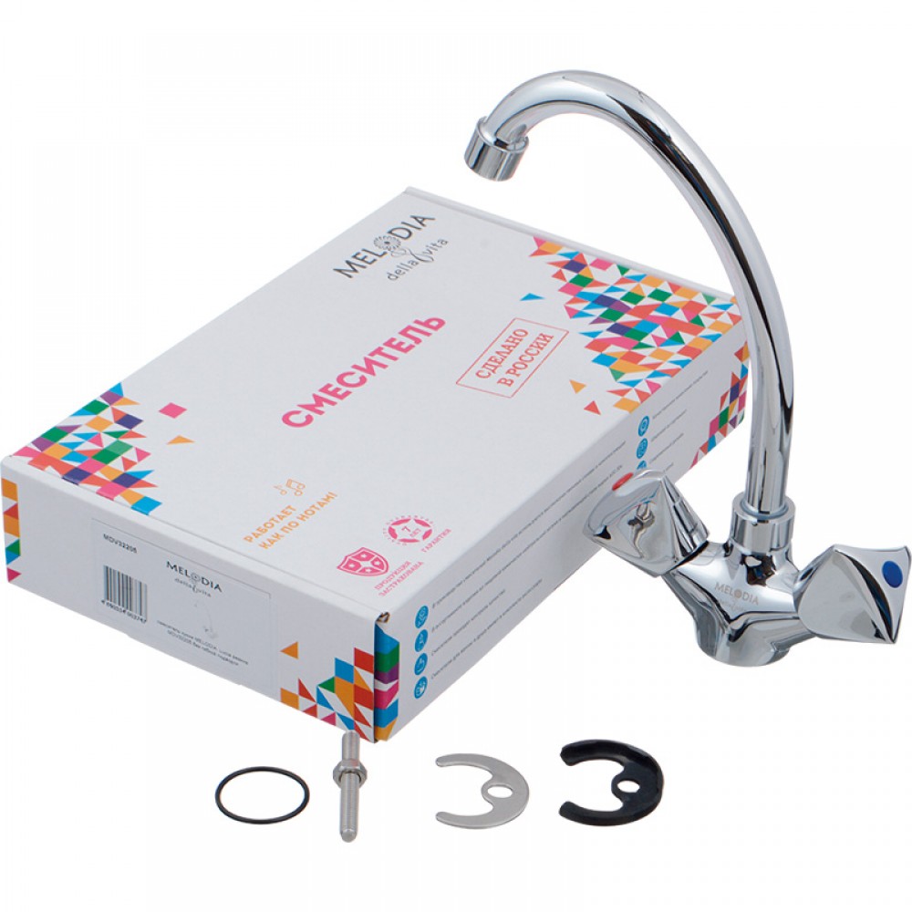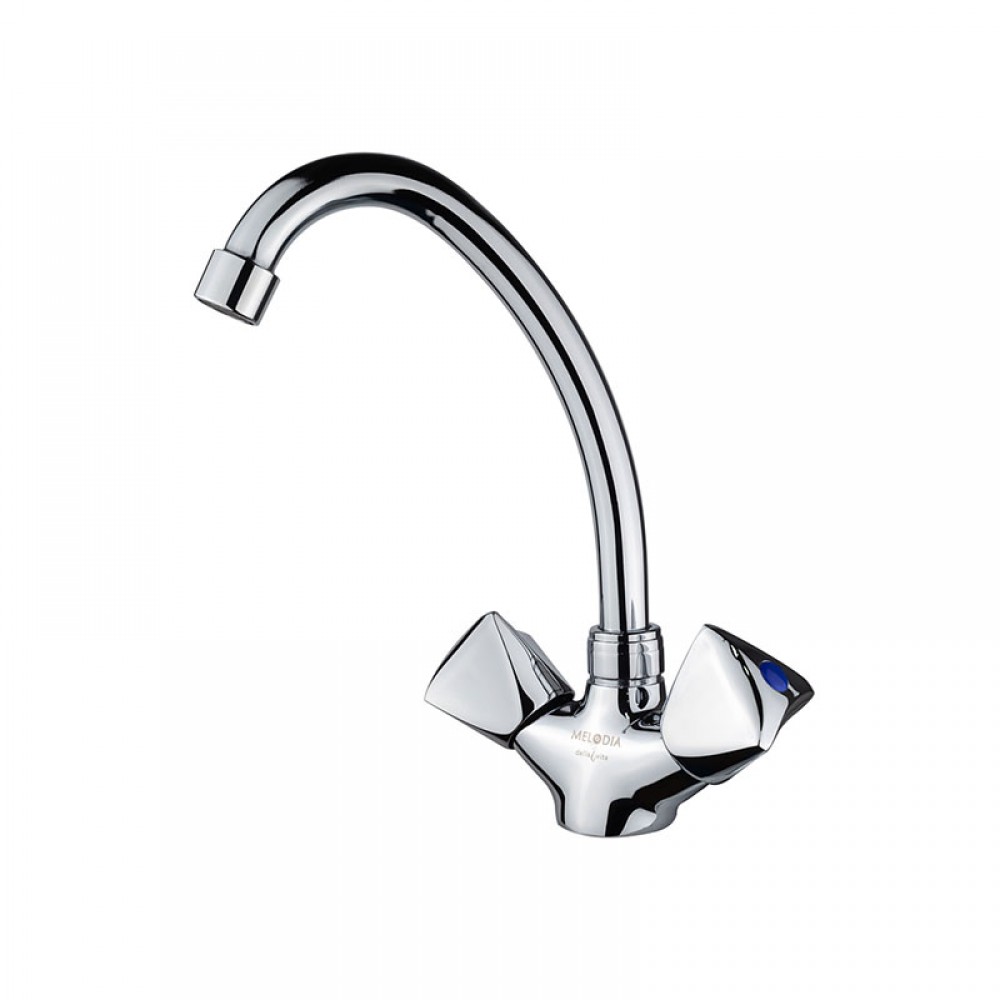 Двухвентильный кухонный смеситель MELODIA Lucia MDV32205 предназначен для установки на кухонную мойку. Классический кран с двумя маховиками треугольной формы обеспечивает точную раздельную настройку температуры и напора воды. Сантехника выполнена в современном стиле и отличается практичным глянцевым хромированным покрытием.