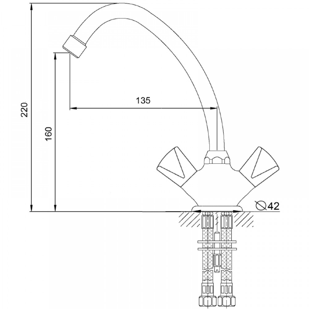 Модель монтируется непосредственно на раковину или столешницу. Изделие поставляется без гибкой подводки в комплекте, что позволяет подобрать шланги необходимой длины индивидуально под конкретные выводы труб.