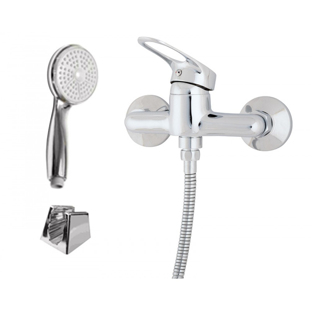 Устройство поставляется в комплекте с круглой однорежимной лейкой увеличенного диаметра (100 мм), гибким шлангом и настенным кронштейном, что позволяет сразу организовать полноценный ручной душ.