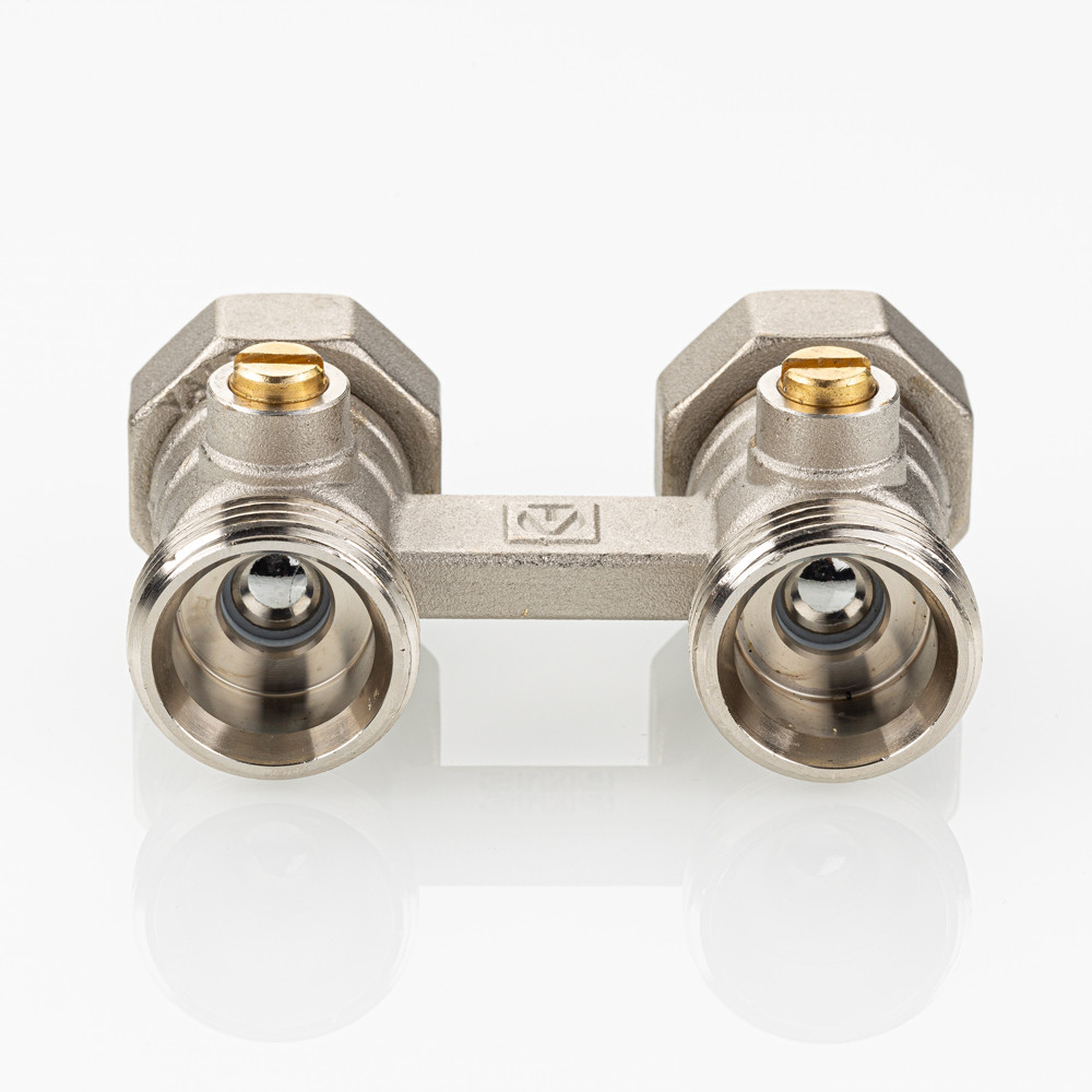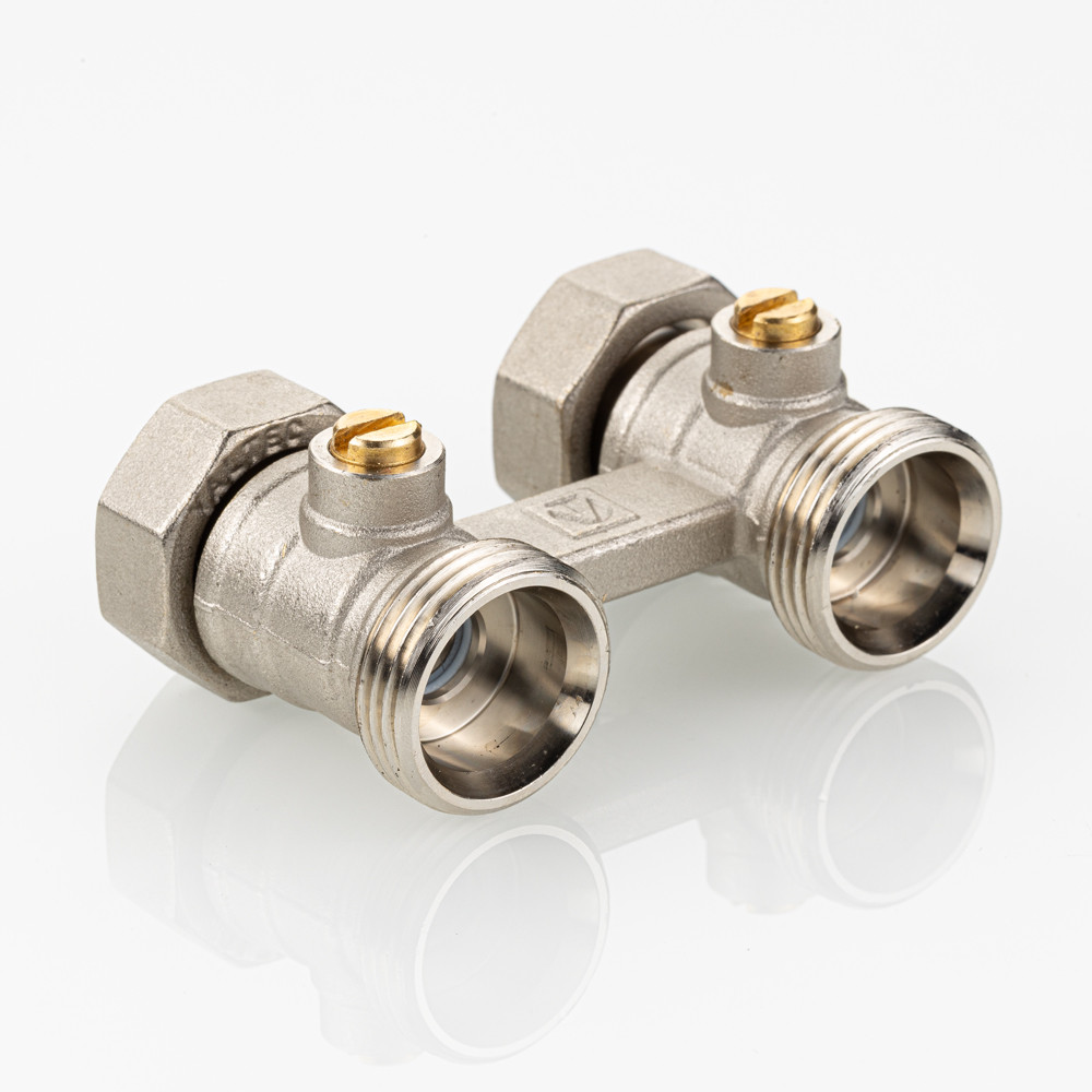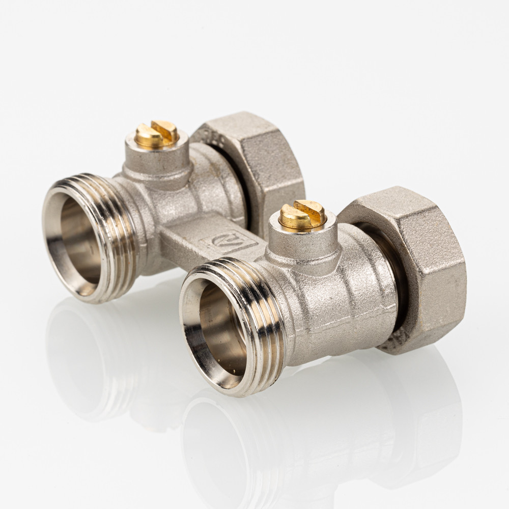 Модификация для двухтрубных систем отопления. Клапан снабжен шаровыми затворами для перекрытия потока. Резьба патрубков для присоединения труб – наружная, 3/4", под фитинг стандарта «евроконус». Патрубки для подключения к радиатору – с накидной гайкой, резьба – внутренняя, 3/4", стандарта «евроконус».