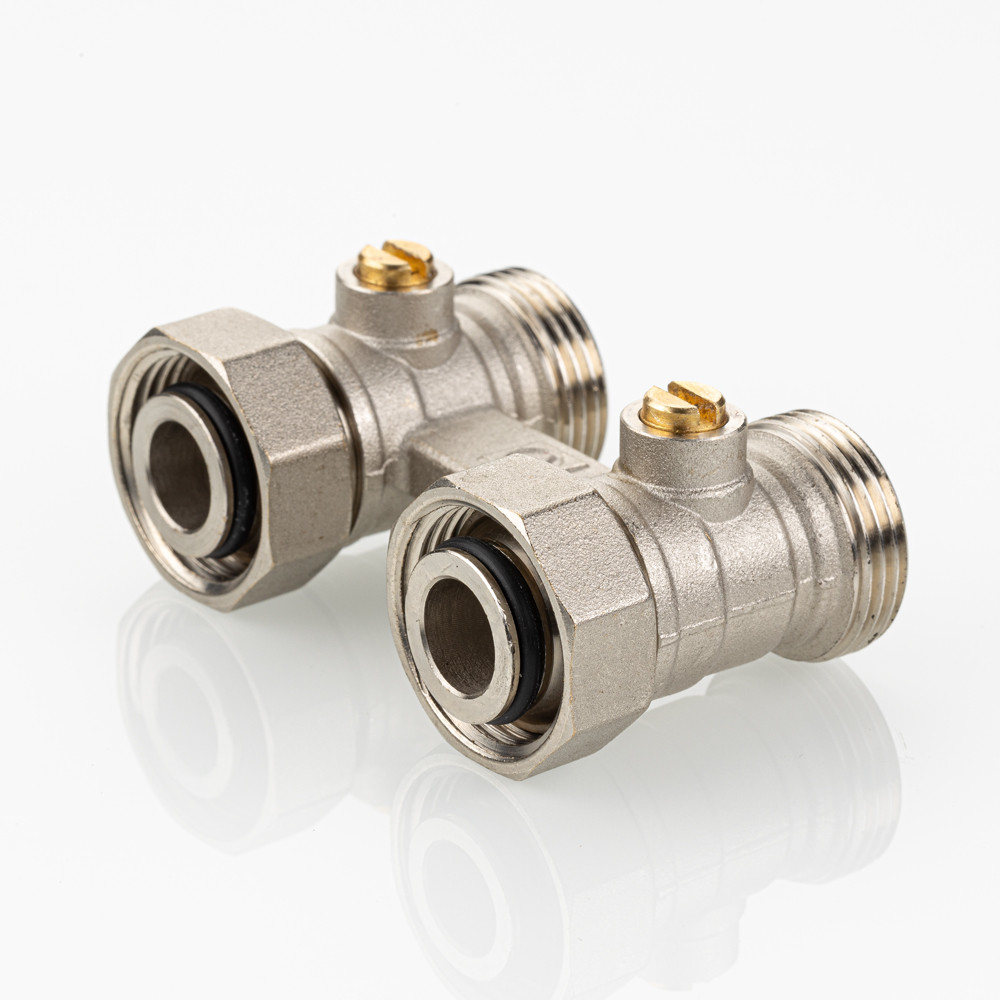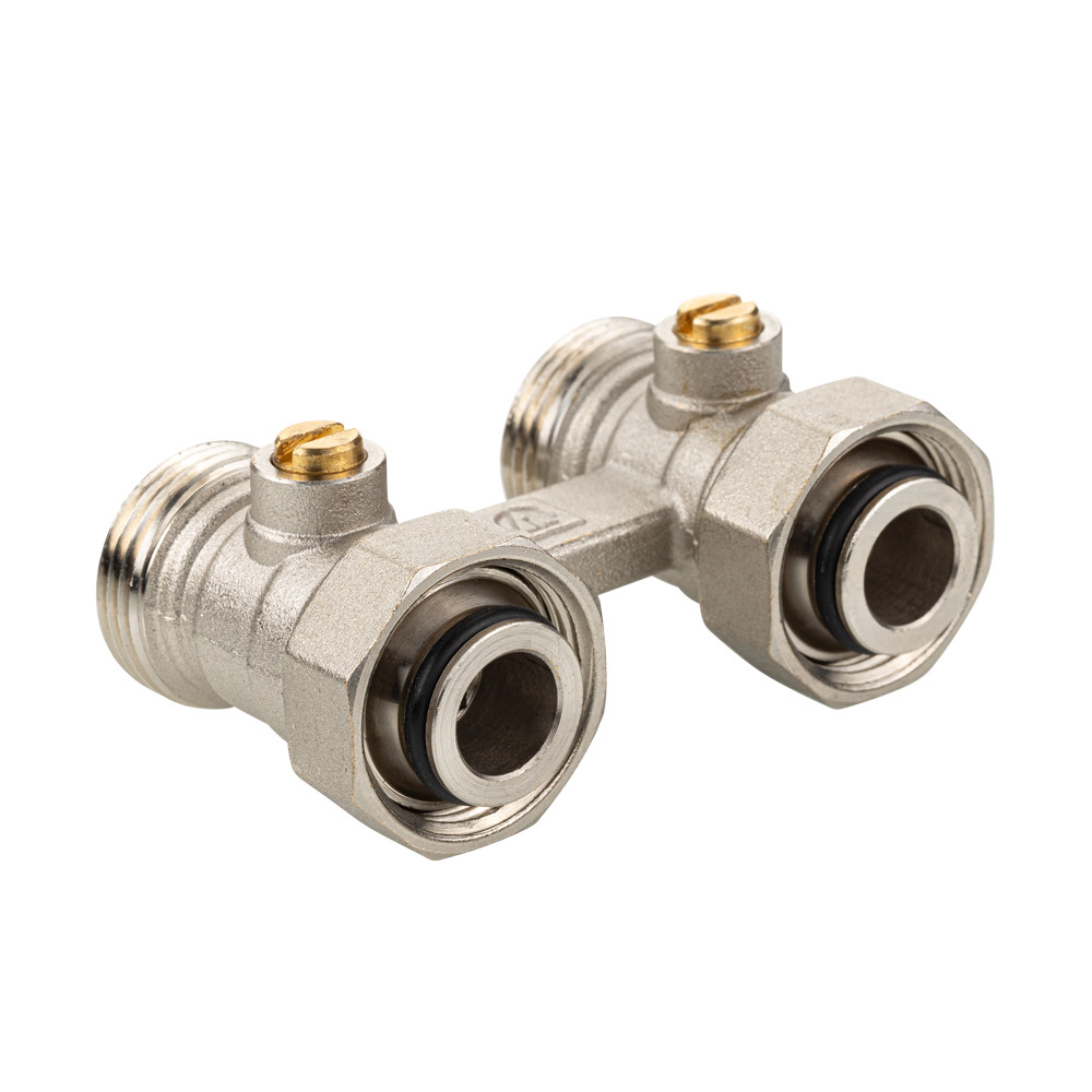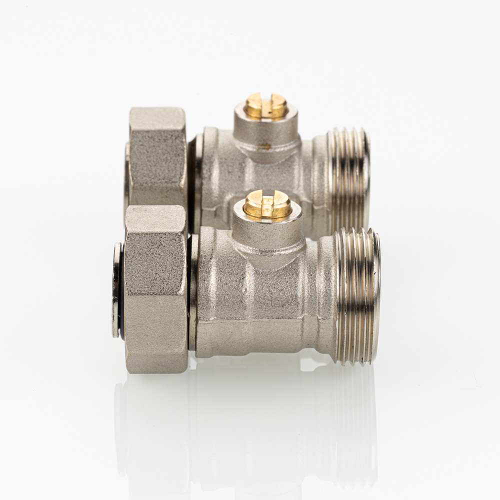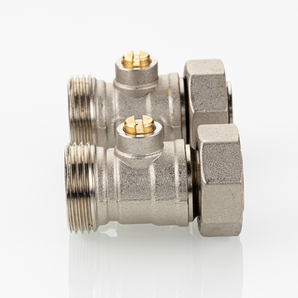 Модификация для двухтрубных систем отопления. Клапан снабжен шаровыми затворами для перекрытия потока. Резьба патрубков для присоединения труб – наружная, 3/4", под фитинг стандарта «евроконус». Патрубки для подключения к радиатору – с накидной гайкой, резьба – внутренняя, 3/4", стандарта «евроконус».