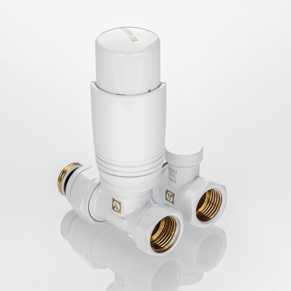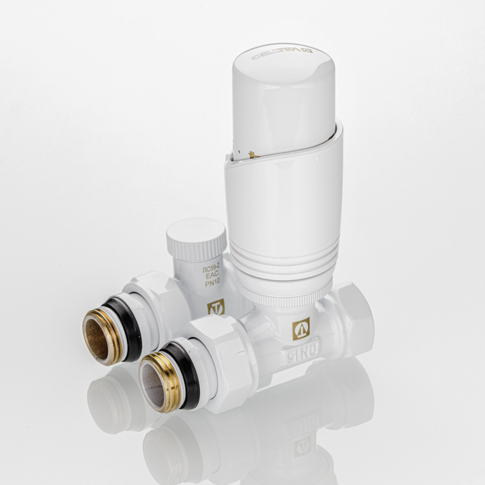 Клапаны и термоголовка комплекта выполнены в белом цвете.