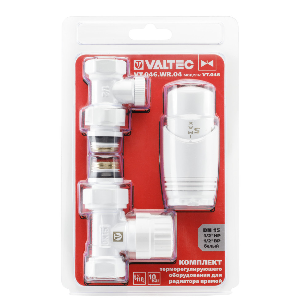 (VT.046.WR) Комплект терморегулирующего оборудования включает в себя прямой термостатический и запорно-регулирующий (настроечный) клапаны, а также термостатическую головку.